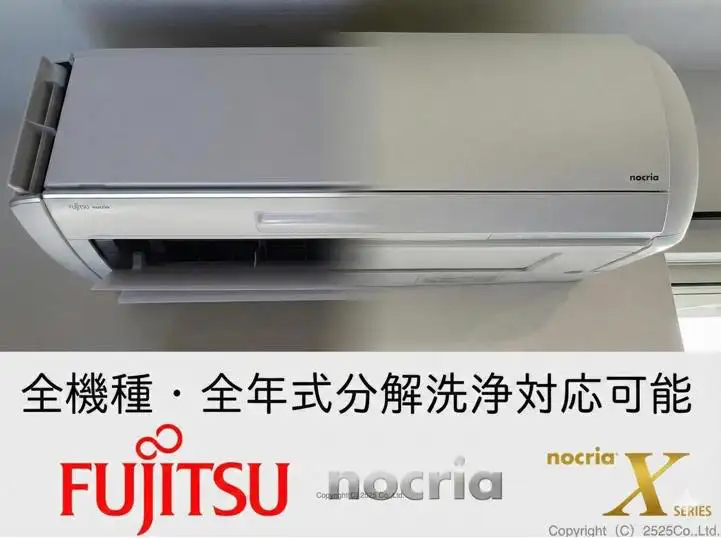 富士通ゼネラル製のエアコンで、室内機の両サイドに動くファンが付いていれば、型番に関わらず全て「nocria X」として分解洗浄いたします。